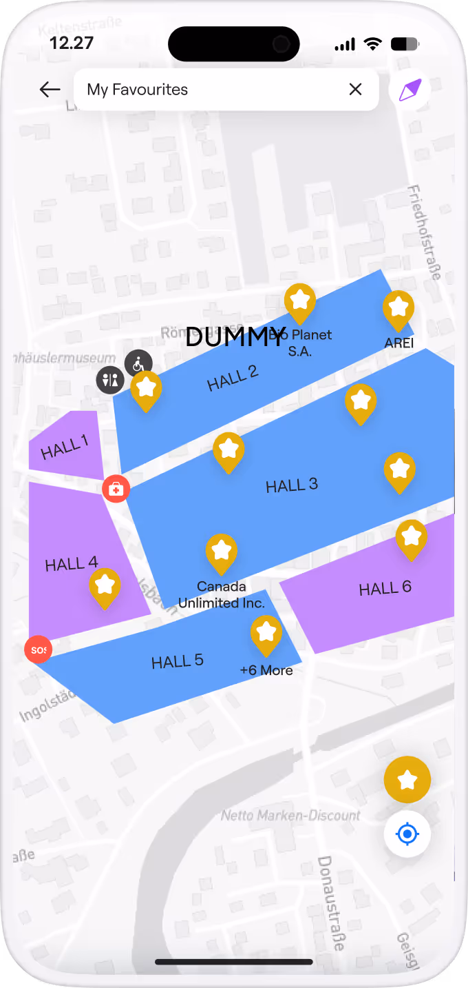 Everything under control: ticketing, QR check-in, badges, floor plan, exhibitors/sessions/sponsoring — plus push updates, matchmaking and real-time dashboard (check-ins, workload, leads, CRM export).